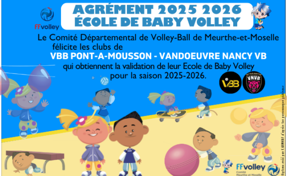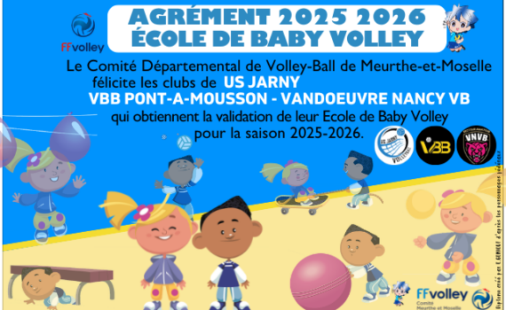 Le CDVB54 est heureux de féliciter les clubs de JARNY, […] AGRÉMENT EN ÉCOLE DE BABY VOLLEY 2025-2026
