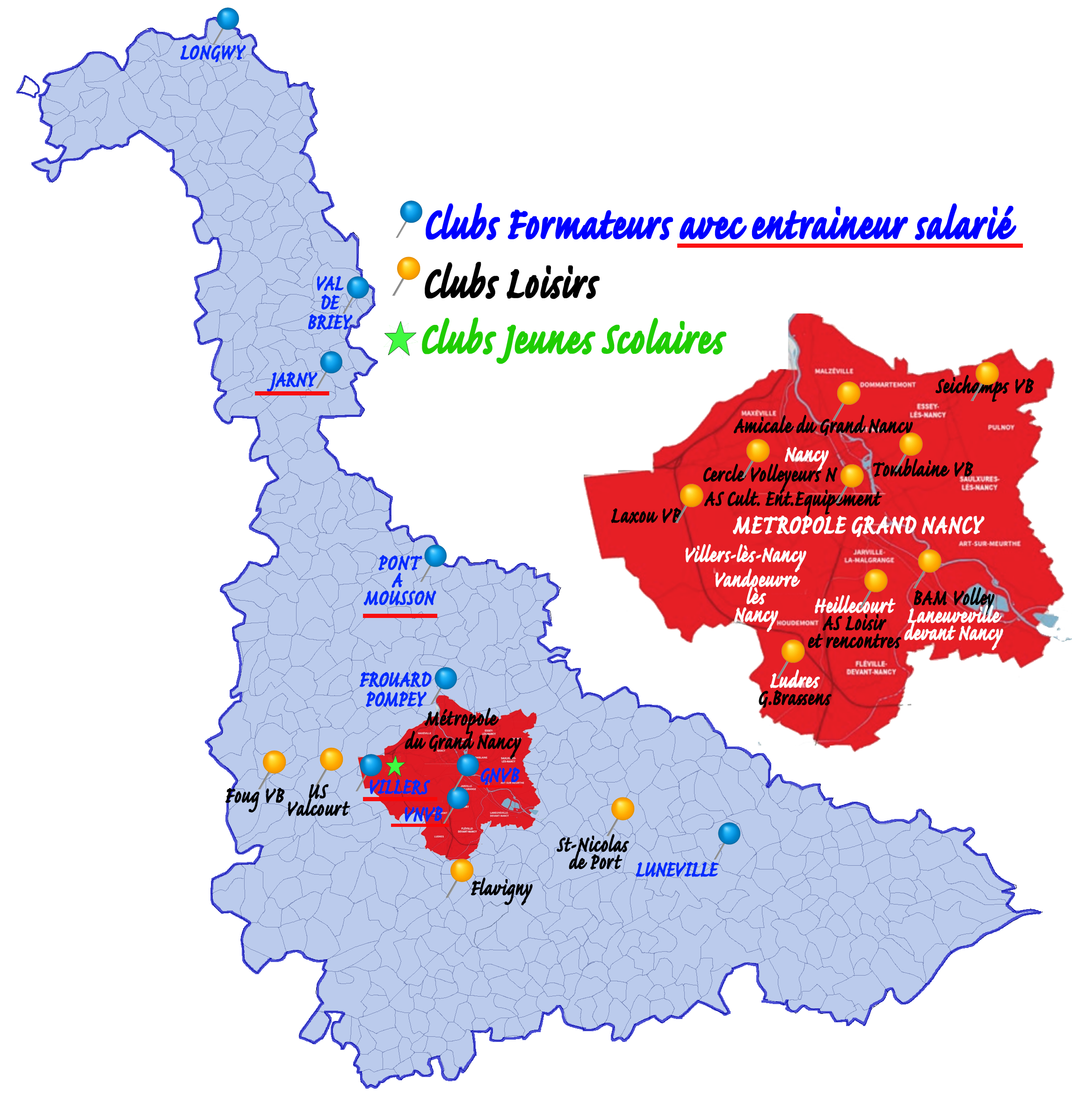 Le Comité Départemental de Volley-Ball 54, comité de la Ligue Grand Est, est composé de 23 clubs.